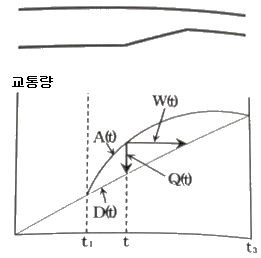 병목흐름(Bottleneck flow)인 상태에서의 도착 차량수와 출발차량수를 누적하여 나타낸 아래의 시간-차량 누적 곡선에 대한 설명으로 옳지 않은 것은?