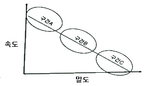 현장 관측자료를 이용한 속도와 밀도의 관계가 아래와 같을 때, 다음 설명 중 옳지 않은 것은?