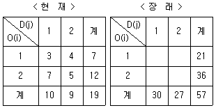 현재 존간 통행량이 아래와 같을 때 균일성장률법에 따른 장래의 존별 통행량이 옳은 것은? (단, tij : 장래의 존 i와 j간의 통행량)