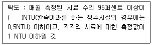 수도법령상 일반수도사업자가 준수해야 할 정수처리된 물의 탁도 등의 기준이다. ( )에 들어갈 내용으로 옳은 것은?