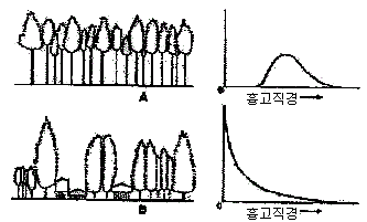 아래의 그림은 숲의 단면적과 흉고직경별 ㏊당 본수를 나타낸 것이다. 숲 A 및 B에 적합한 임분의 명칭이 순서대로 바르게 나열된 것은?