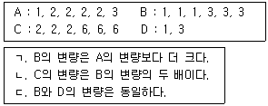 단, x는 편차점수)'으로 정의할 때, 2개 또는 6개의 측정값을 가진 A, B, C, D의 변량에 관한 설명으로 옳은 것을 모두 고른 것은?