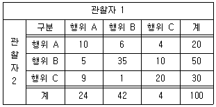 다음은 2명의 관찰자가 100명의 아동을 대상으로 그 행위를 분류한 표이다. 이에 관한 설명으로 옳지 않은 것은?