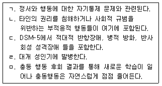 DSM-5에서 파괴적, 충동통제 및 품행장애의 특징을 짝지은 것은?
