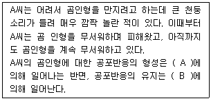 다음 사례에서 A씨가 곰인형에 대해 공포 반응을 형성하고 유지해 나가는 과정을 Mowrer의 2요인이론(two-factor theory)으로 설명하려고 한다. ( )안에 알맞은 것은?
