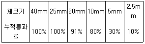 어래 표와 같은 골재 체가름 성과표에 의하면 굵은 골재 최대치수는?