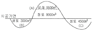 그림과 같은 지반에서 (A)의 흙은 굴착하여 (B), (C)에 성토하고자 한다. 성토가 완료된 후 (A)에 남은 흙은 자연상태로 얼마인가? (단, 모래부터 굴착하며, 모래의 C=0.9, 점토의 C=0.93)