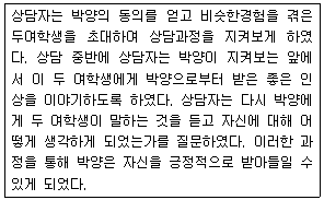 박양(중2)은 가정폭력 피해 문제로 상담을 받게 되었다. 다음의 상담 상황에서 상담자의 개입으로 옳지 않은 것은?