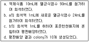 액체 식품 중의 생균수를 표준한천평판배양법으로 아래와 같이 측정하였을 때 식품 1mL내의 colony 수는?