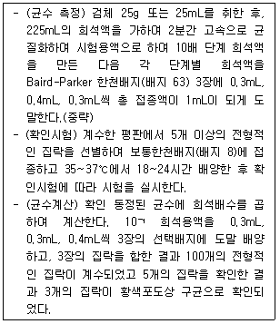 아래의 황색포도상구균 정량 시험 후 시험용액 1mL 당 균수를 계산하면 얼마인가?