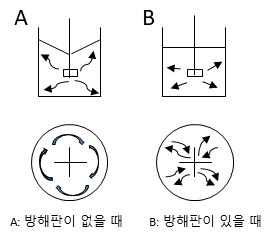 다음은 강하게 혼합시키는 교반기의 용기 벽면에 설치된 방해판(baffle plate)에 대한 그림이다. 위의 그림은 측면도이고, 아래 그림은 위에서 내려다 본 평면도이다. 방해판의 역할에 대한 A와 B의 비교 설명 중에서 그 원리가 틀린 것은?