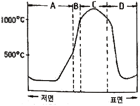 그림은 소결 과정 중 점화 후 약 10분이 경과하였을 때 소결층 내의 수직 단면상 온도 분포를 나타낸 것이다. B가 나타내는 것으로 옳은 것은?
