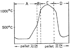 그림은 소결 과정 중 점화 후 약 10분이 경과하였을 때 소결층 내의 수직 단면상 온도 분포를 나타낸 것이다. B가 나타내는 것으로 옳은 것은?