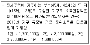 국민기초생활보장 대상 가구의 월 생계급여액은? (단, 다음에 제시된 2019년 기준으로 계산한다.)