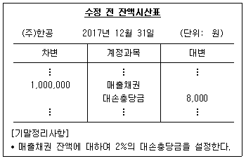 다음은 (주)한공의 매출채권 관련 자료이다. [기말정리사항]을 반영한 후의 2017년 재무상태표상의 대손충당금과 손익계산서상의 대손상각비는 얼마인가? (단, 기중에 계상된 대손상각비는 없다.) (순서대로 대손충당금, 대손상각비)