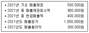 다음 자료를 토대로 (주)한공의 2021년 12월 31일의 매출채권 금액을 계산하면 얼마인가?(현금매출액 외에는 모두 외상매출액으로 가정한다.)