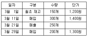 다음은 (주)한공의 2018년 3월 상품 재고장이다. (주)한공이 재고자산평가시 선입선출법을 적용할 경우에 3월말 재고자산은 얼마인가?