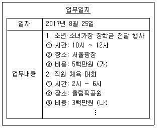다음은 (주)한공의 업무일지의 일부이다. (가)와 (나)를 회계처리할 때 차변 계정과목으로 옳은 것은? (순서대로 (가), (나))