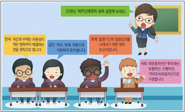 다음은 재무상태표에 대한 대화이다. 선생님의 질문에 바르게 대답한 학생은?