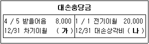 다음은 (주)한공의 받을어음에 대한 대손충당금 계정이다. 결산일 현재 1,000,000원의 받을어음에 대하여 3%의 대손을 예상할 때 (가)와 (나)에 들어갈 금액으로 옳은 것은?