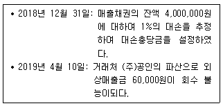 다음은 (주)한공의 매출채권 및 대손 관련 자료이다. 2019년 4월 10일 거래에서 발생한 대손상각비는 얼마인가?