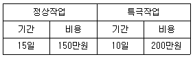 어떤 공장에서 작업을 하는데 있어서 소요되는 기간과 비용이 다음 표와 같을 때 비용구배는? (단, 활동시간의 단위는 일(日)로 계산한다.)