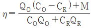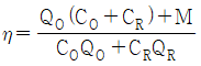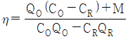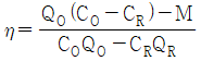 외기 및 반송(return)공기의 분진량이 각각 CO, CR이고, 공급되는 외기량 및 필터로 반송되는 공기량이 각각 QO, QR이며, 실내 발생량이 M이라 할 때, 필터의 효율(η)을 구하는 식으로 옳은 것은?