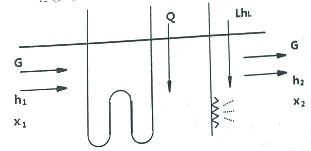 다음과 같이 단열된 덕트 내에 공기가 통하고 이것에 열량 Q(kJ/h)와 수분L(kg/h)을 가하여 열평형이 이루어 졌을 때, 공기에 가해진 열량(Q)은 어떻게 나타내는가? (단, 공기의 유량은 G(kg/h), 가열코일 입ㆍ출구의 엔탈피, 절대습도를 각각 h1, h2(kJ/kg), x1, x2(kg/kg)이며, 수분의 엔탈피는 hL(kJ/kg)이다.)