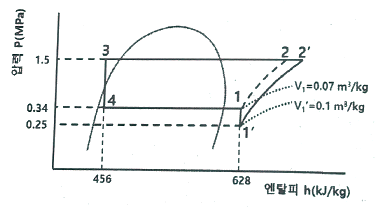 그림에서 사이클 A(1-2-3-4-1)로 운전될 때 증발기의 냉동능력은 5RT, 압축기의 체적효율은 0.78이었다. 그러나 운전 중 부하가 감소하여 압축기 흡입밸브 개도를 줄여서 운전하였더니 사이클 B(1‘-2’-3-4-1-1‘)로 되었다. 사이클 B로 운전될 때의 체적효율이 0.7이라면 이 때의 냉동능력(RT)은 얼마인가? (단, 1RT는 3.8kW이다.)