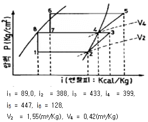 다음 P-i선도와 같은 2단 압축 2단 팽창 사이클로 운전되는 NH3냉동장치에서 고단측냉매 순환량(kg/h)는 얼마인가? (단, 냉동능력은 55000kcal/h 이다.)