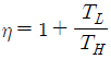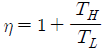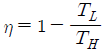 이론적인 카르노 열기관의 효율(η)을 구하는 식으로 옳은 것은? (단, 고열원의 절대온도는 TH, 저열원의 절대온도는 TL이다.)