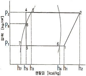 그림은 냉동사이클을 압력-엔탈피선도에 나타낸 것이다. 이 그림에 대한 설명으로 옳은 것은?