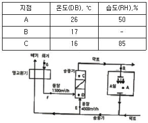 아래 그림에 나타낸 장치를 표의 조건으로 냉방운전을 할 때 A실에 필요한 송풍량(m3/h)은? (단, A실의 냉방부하는 현열부하 8.8kW, 잠열부하 2.8kW이고, 공기의 정압비열은 1.01kJ/kgㆍK, 밀도는 1.2kg/m3이며, 덕트에서의 열손실은 무시한다.)