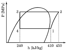 아래의 사이클이 적용된 냉동장치의 냉동능력이 119kW일 때 다음 설명 중 틀린 것은? (단, 압축기의 단열효율 ηc는 0.7, 기계효율 ηm 은 0.85이며, 기계적 마찰손실 일은 열이 되어 냉매에 더해지는 것으로 가정한다.)