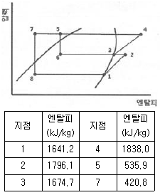 다음 그림과 같은 2단압축 1단 팽창식 냉동장치에서 고단측의 냉매 순환량(kg/h)은? (단, 저단측 냉매 순환량은 1000kg/h이며, 각 지점에서의 엔탈피는 아래 표와 같다.)