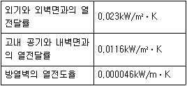 냉장고의 방열벽의 열통과율이 0.000117kW/m2ㆍK일 때 방열벽의 두께(cm)는? (단, 각값은 아래 표와 같으며, 방열재 이외의 열전도 저항은 무시하는 것으로 한다.)