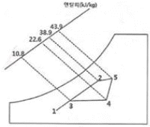 다음 공기선도 상에서 난방풍량이 25000m3/h인 경우 가열코일의 열량(kW)은? (단, 1은 외기, 2는 실내 상태점을 나타내며, 공기의 비중량은 1.2kg/m3이다.)