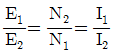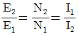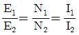 변압기의 1차 및 2차의 전압, 권선수, 전류를 각각 E1, N1, I1 및 E2, N2, I2라고 할 때 성립하는 식으로 옳은 것은?