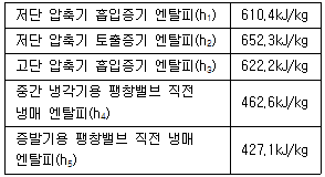 2단압축 1단팽창 냉동장치에서 고단 압축기의 냉매 순환량을 G2, 저단 압축기의 냉매 순환량을 G1이라고 할 때 G2/G1은 얼마인가?
