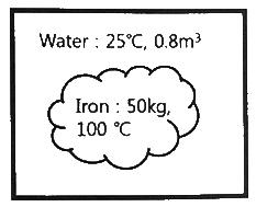 그림과 같은 단열된 용기 안에 25℃의 물이 0.8m3 들어있다. 이 용기 안에 100℃, 50kg의 쇳덩어리를 넣은 후 열적 평형이 이루어 졌을 때 최종 온도는 약 몇 ℃ 인가? (단, 물의 비열은 4.18 kJ/(kg·K), 철의 비열은 0.45 kJ/(kg·K) 이다.)
