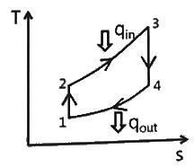 어떤 기체 동력장치가 이상적인 브레이턴 사이클로 다음과 같이 작동할 때 이 사이클의 열효율은 약 몇 % 인가? (단, 온도(T) - 엔트로피(s) 선도에서 T1 = 30℃, T2 = 200℃, T3 = 1060℃, T4 = 160℃ 이다.)
