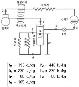 만액식 증발기를 사용하는 R134a용 냉동장치가 아래와 같다. 이 장치에서 압축기의 냉매 순환량이 0.2kg/s이며, 이론 냉동 사이클의 각 점에서의 엔탈피가 아래표와 같을 때, 이론 성능 계수 (COP)는? (단, 배관의 열손실은 무시한다.)