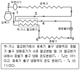 다음의 장치는 액-가스 열교환기가 설치되어 있는 1단 증기압축식 냉동장치를 나타낸 것이다. 이 냉동장치의 운전 시에 아래와 같은 현상이 발생하였다. 이 현상에 대한 원인으로 옳은 것은?