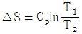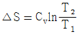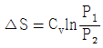 단위질량의 이상기체가 정적과정 하에서 온도가 T1에서 T2로 변하였고, 압력도 P1에서 P2로 변하였다면, 엔트로피 변화량 △S는? (단, Cv와 Cp는 각각 정적비열과 정압비열이다.)