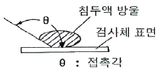 침투탐상시험에서 침투액이 가장 잘 침투되려면 그림의 접촉각 θ의 조건은?