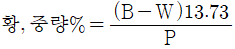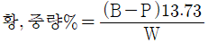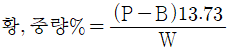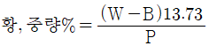 보일러 및 압력용기에 대한 표준침투탐상검사(ASME Src.V Art.24 SD-129)에 의한 석유제품에 있는 황에 대한 표준시험방법에서 시료의 황 함유량의 계산식으로 맞는 것은? (단, P=시료로부터 얻은 BaSO4의 무게(g), B=블랭크로부터 얻은 BaSO4의 무게(g), W=사용된 시료의 무게(g)이다.)