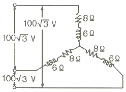그림과 같은 평형 3상 Y결선에서 각 상이 8Ω의 저항과 6Ω의 리액턴스가 직렬로 연결된 부하에 선간전압 100√3 V 가 공급되었다. 이때 선전류는 몇 A 인가?