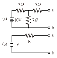 테브난의 정리를 이용하여 (a)회로를 (b)와 같은 등가 회로로 바꾸려 한다. V[V]와 R[Ω]의 값은?