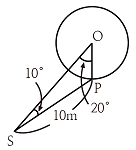 그림과 같이 광원 S로 단면의 중심이 O인 원통형 연돌을 비추었을 때 원통의 표면상의 한 점 P에서의 조도는 약 몇 lx인가? (단, SP의 거리는 10m, ∠OSP=10°,∠OSP=20°, 광원의 SP 방향의 광도를 1000cd라고 한다.)
