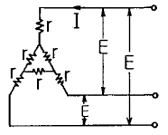 r(Ω)인 6개의 저항을 그림과 같이 접속하고 평형 3상 전압 E를 가했을 때 전류 I 는 몇 A인가? (단, r=3Ω, E=60V이다.)
